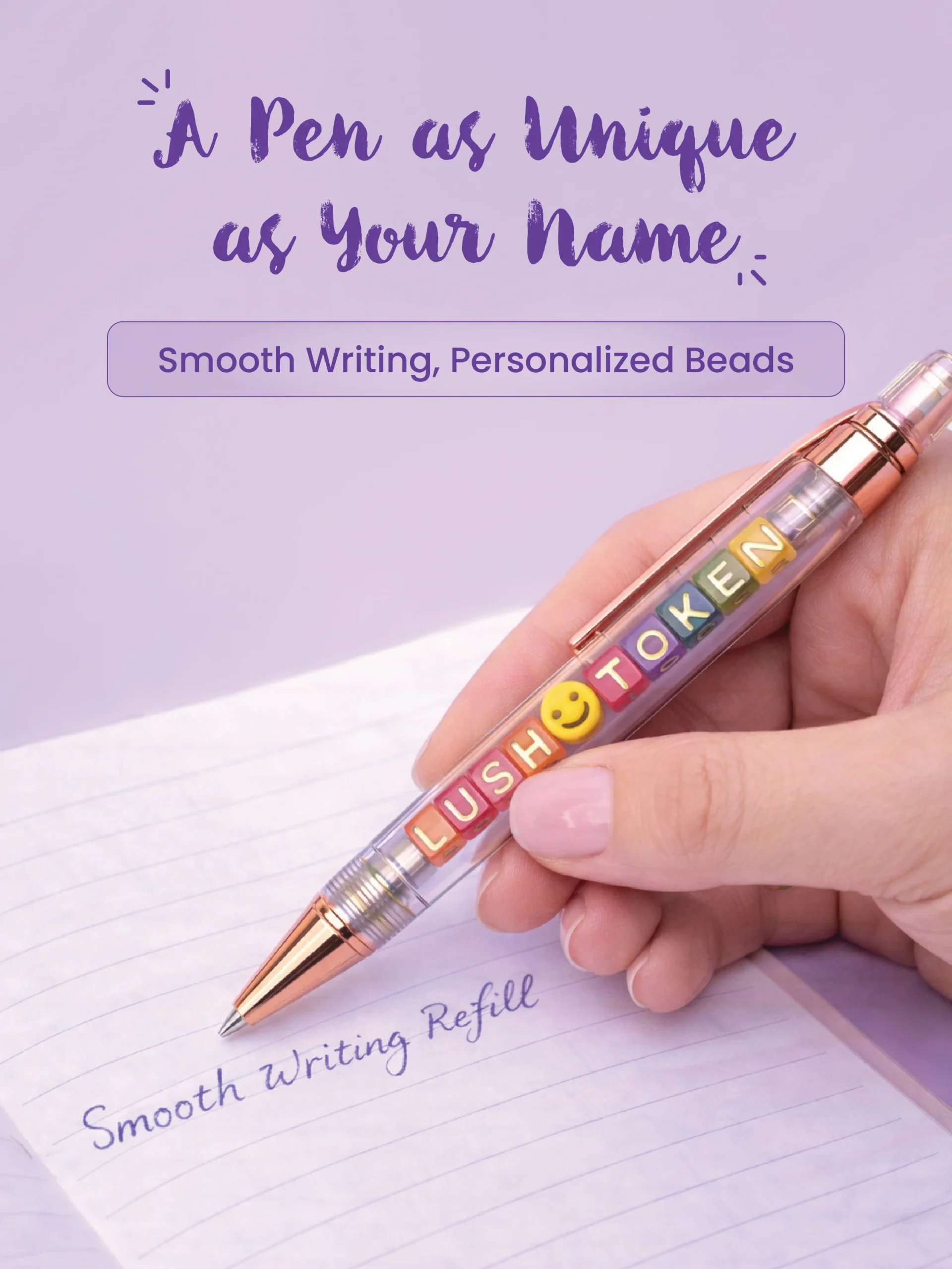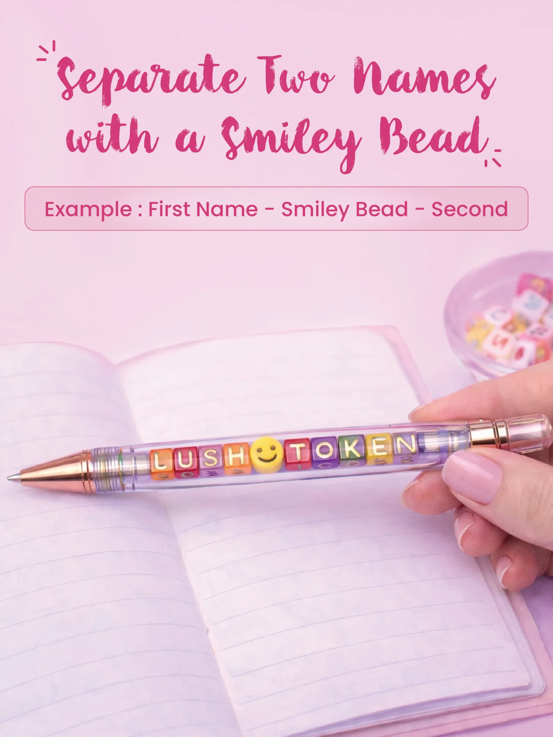 Design a pen that’s totally you. Add up to 11 beads with names, words, or smileys and turn everyday writing into something personal.